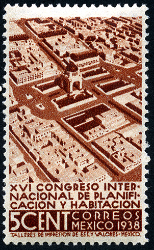 Para más información favor de dirigirse a biblioteca@mufi.org.mx No. Scott: 741 -- Año de Emisión: 1938 -- Valor facial: Cinco Centavos -- Variedad de color: Café Rojizo -- Perforación: 14 -- Tipo de impresión: Grabado Timbre Postal Mexicano en color café rojizo, en él se observa una vista aérea del Monumento a la Revolución Mexicana, escultura histórica perteneciente al Estado de México, en la parte inferiror aparece escrito "XVI CONGRESO INTERNACIONAL DE PLANIFICACION Y HABITACION", valor facial de "5 CENT" y "CORREOS MEXICO 1938"