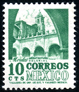 Convento La Natividad Tepoztlán Morelos. -- Con marca de Agua: MEX-MEX Y ÁGUILA EN CÍRCULO ABIERTO EN POSICIÓN VERTICAL ( XVI ) -- Fotograbado -- Con Perforación -- Diez Centavos -- Verde Oscuro