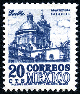 Catedral de la Ciudad de Puebla. -- Con marca de Agua: MEX-MEX Y ÁGUILA EN CÍRCULO ABIERTO EN POSICIÓN VERTICAL ( XVI ) -- Fotograbado -- Con Perforación -- Veinte Centavos -- Azul Violáceo
