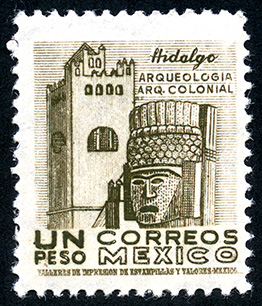 Convento de Actopan y Cabeza de Atlante Estado de Hidalgo. -- Con marca de Agua: MEX-MEX Y ÁGUILA EN CÍRCULO ABIERTO EN POSICIÓN VERTICAL ( XVI ) -- Grabado -- Con Perforación -- Un Peso -- Café Olivo