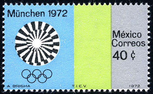 No. Scott: 1047 -- Año de Emisión:1972 -- Valor facial: Cuarenta Centavos -- Variedad de color: Azul, Verde, Plata y Negro -- Perforación: 14 -- Tipo de impresión: Grabado Timbre Postal Mexicano en colores azul, verde, plata y negro, en la imagen se observa el emblema olímpico de los juegos realizados en Munich, en la parte superior izquierda está escrito " München 1972", en el centro del lado derecho "MEXICO CORREOS" y el valor facial de "40 C". Para más información favor de dirigirse a biblioteca@mufi.org.mx