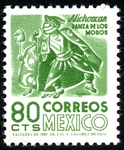 No. Scott: 1094 -- Año de Emisión: 1975 -- Valor facial: Ochenta Centavos -- Variedad de color: Verde Oscuro -- Perforación: 14 -- Tipo de impresión: Grabado Timbre Postal Mexicano en color verde oscuro, en la imagen se observa un danzante, representando la danza de los Moros del estado de Michoacán, en la parte inferior aparece escrito "CORREOS MEXICO" y el valor facial de "80 C". Para más información favor de dirigirse a biblioteca@mufi.org.mx