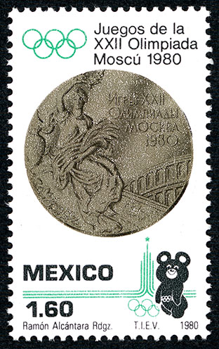 No. Scott: 1205 -- Año de Emisión: 1980 -- Valor facial: Un Peso con Sesenta Centavos -- Variedad de color: Bronce, Verde-Azul y Negro -- Perforación: 14 -- Tipo de impresión: Grabado Timbre Postal Mexicano en colores bronce, verde-azul y negro, en la imagen se observa una medallla de bronce de la XXII Olimpiada en Moscú, en la parte superior aparecen los aros olímpicos y escrito "JUEGOS DE LA XXII OLIMPIADA MOSCÚ 1980", en la parte inferior "MEXICO", y el valor facial de "1.60", así también Miska, el oso simbólico de los juegos. Para más información favor de dirigirse a biblioteca@mufi.org.mx