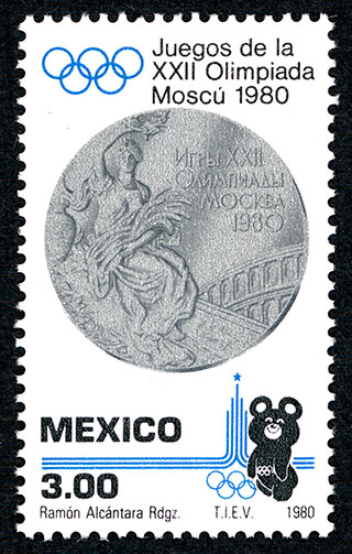 No. Scott: 1206 -- Año de Emisión: 1980 -- Valor facial: Tres Pesos -- Variedad de color: Plata, Azul y Negro -- Perforación: 14 -- Tipo de impresión: Grabado Timbre Postal Mexicano en colores plata, azul y negro, en la imagen se observa una medallla de bronce de la XXII Olimpiada en Moscú, en la parte superior aparecen los aros olímpicos y escrito "JUEGOS DE LA XXII OLIMPIADA MOSCÚ 1980", en la parte inferior "MEXICO", y el valor facial de "3.00", así también Miska, el oso simbólico de los juegos. Para más información favor de dirigirse a biblioteca@mufi.org.mx