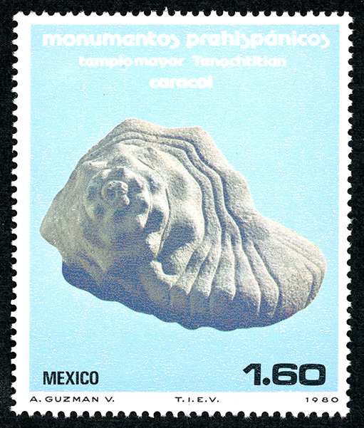 No. Scott: 1209 -- Año de Emisión: 1980 -- Valor facial: Un Peso con Sesenta Centavos -- Variedad de color: Azul, Gris y Negro -- Perforación: 14 -- Tipo de impresión: Grabado Timbre Postal Mexicano en colores azul, gris y negro, en la imagen se observa un caracol prehispánico de Tenochtitlan, en la parte superior está escrito "MONUMENTOS PREHISPÁNICOS", "TEMPLO MAYOR TENOCHTITLAN", "CARACOL", en la parte inferior "MEXICO" y el valor facial de "1.60". Para más información favor de dirigirse a biblioteca@mufi.org.mx
