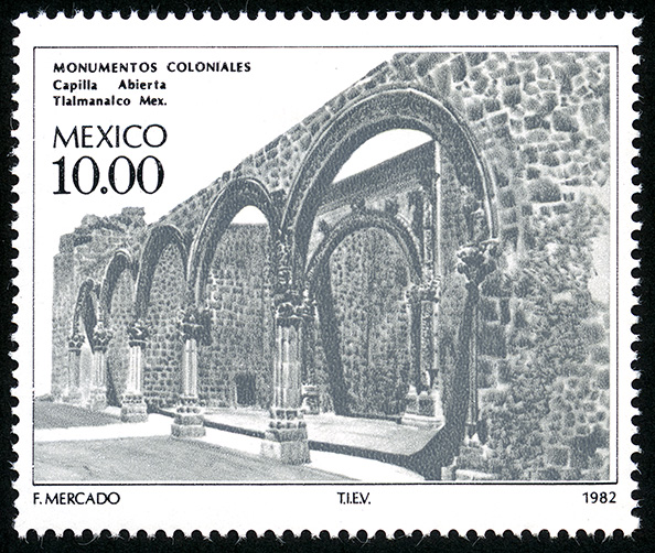 No. Scott: 1305 -- Año de Emisión: 1982 -- Valor facial: Diez Pesos -- Variedad de color: Gris y Negro -- Perforación: 14 1/2 x 14 -- Tipo de impresión: Grabado Timbre Postal Mexicano en colores gris y negro, en la imagen observamos la fachada de un monumento colonial, correspondiente a la Capilla Abierta de Tlalmanalco en la Ciudad de México, también aparece escrita la palabra "MEXICO" y el valor facial de "10.00". Para más información favor de dirigirse a biblioteca@mufi.org.mx