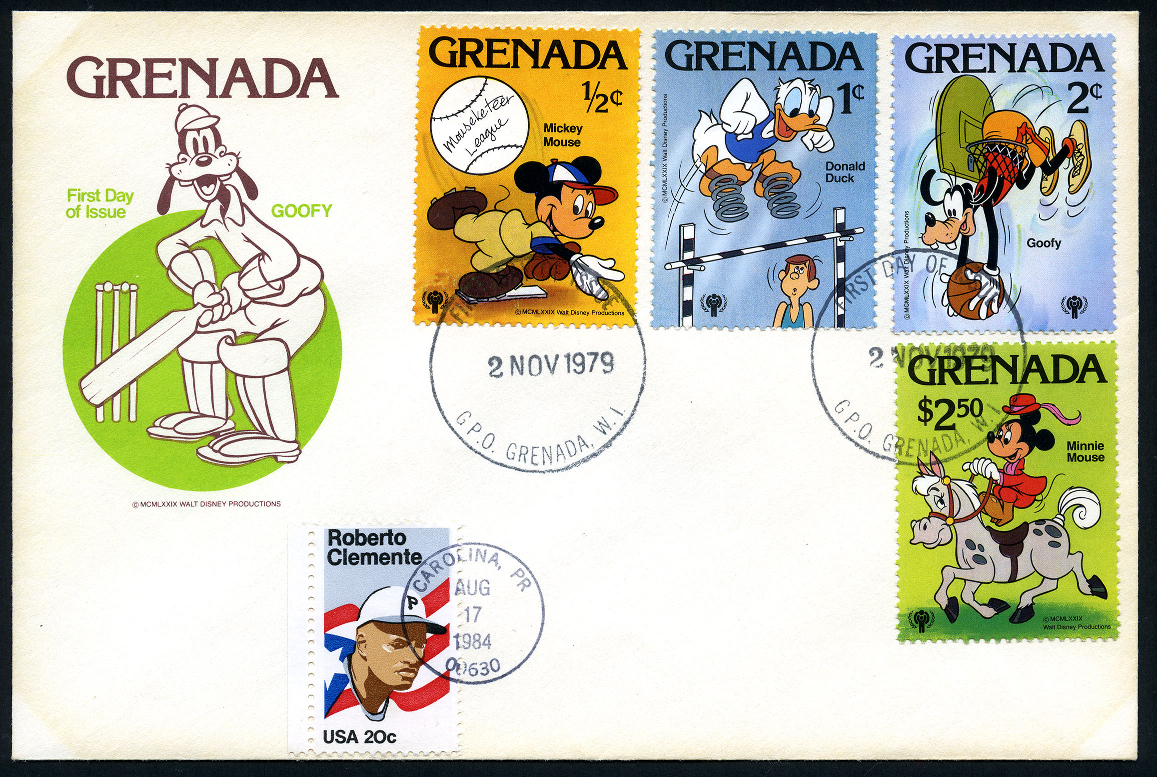 No. Scott: 950, 951, 952, 958 -- Año de emisión: 1979 -- Valor facial: 0.5c, 1c, 2c, 2,5c -- Multicolor -- Con perforación: 11 -- Tipo de Impresión: Litografía. Granada, 1979. Walt Disney. Sobre de Primer Día de emisión con sellos de cancelación, ilustración de Goofy jugando criquet y cinco timbres: a) Mickey Mouse jugando beisbol; b) Pato Donald saltando obstáculos; c) Goofy jugando basquetbol; d) Minnie Mouse practicando equitación; y e) Roberto Clemente. Para más información favor de dirigirse a biblioteca@mufi.org.mx.
