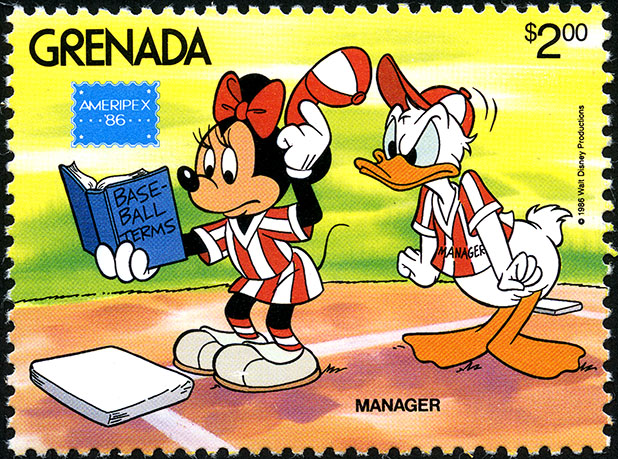 No. Scott: 1381 -- Año de emisión: 1986 -- Valor facial: 2d -- Multicolor -- Con perforación: 11 -- Tipo de Impresión: Litografía. Minnie Mouse estudiando las reglas del juego en el campo de juego. Colección presentada en la Exhibición Americana de Filatelia Internacional, Ameripex '86. Para más información favor de dirigirse a biblioteca@mufi.org.mx.