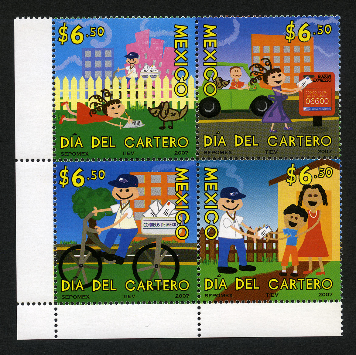 No. Scott: 2559 -- Año de Emisión: 2007 -- Valor Facial: $ 26.00 -- Multicolor -- Perforación:13 x 13 -- Tipo de Impresión: OffsetBloque de cuatro Timbres Postales de México alusivos al Día del Cartero, en las imágenes aparecen ilustraciones de caricaturas, en la primera se observa a una niña escribiendo una carta, en la segunda, está la niña depositando la carta en un buzón, en la tercera, se aprecia a en cartero un bicicleta, llevando muchos sobres en una caja que tiene escrito CORREOS DE MÉXICO, en la última imagen aparece el cartero entregando la carta a su destinatario. Sobre cada estampilla está escrito el valor facial de "$6.50", "MÉXICO", "DÍA DEL CARTERO", y "SEPOMEX, TIEV, 2007".