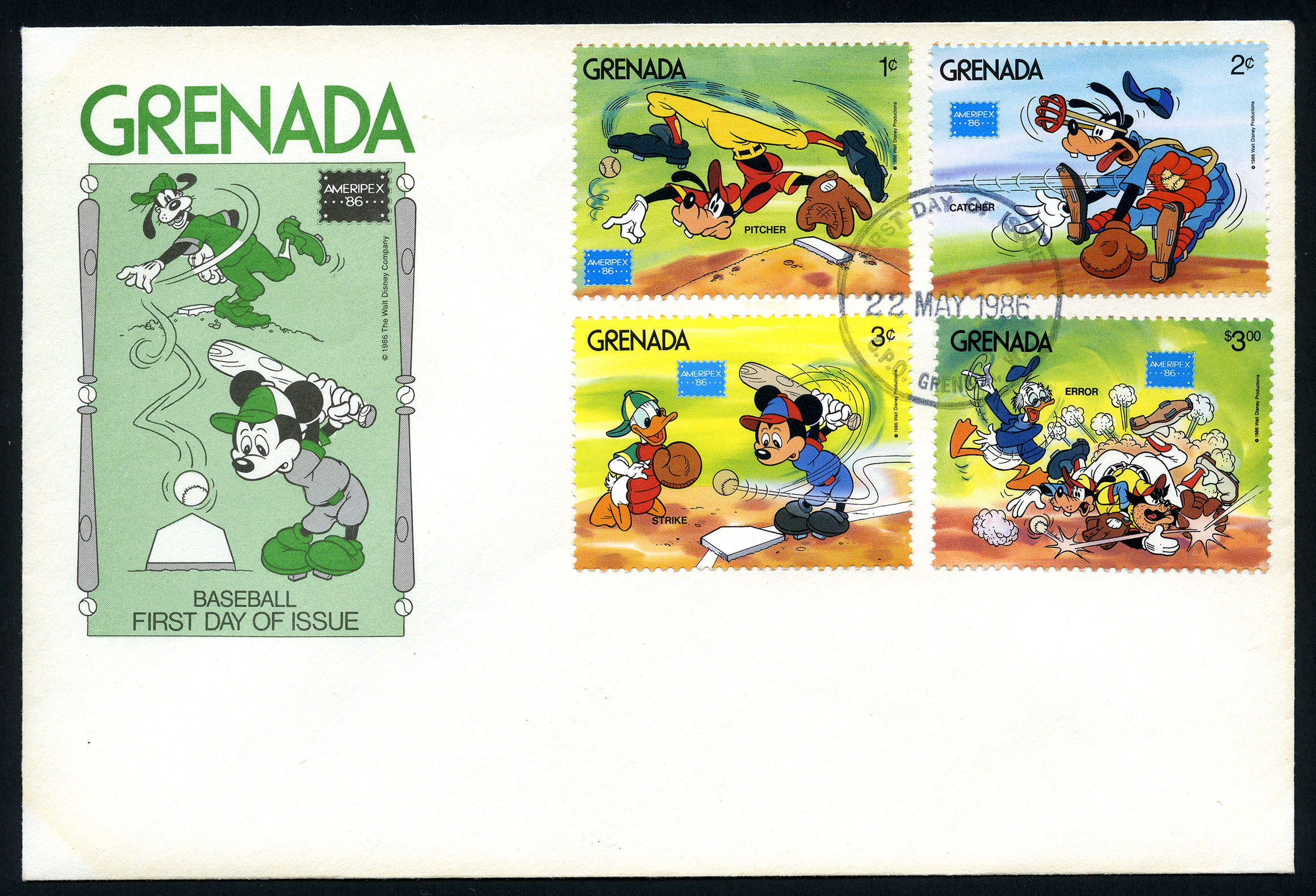 No. Scott: 1375, 1376, 1377, 1382 -- Año de emisión: 1986 -- Valor facial: 1c, 2c, 3c, 3d -- Multicolor -- Con perforación: 11 -- Tipo de Impresión: Litografía. Sobre de Primer Día de emisión con sello de cancelación y cuatro timbres de la serie Ameripex '86 con los personajes de Walt Disney jugando beisbol: a) Goofy como lanzador; b) Goofy como receptor; c) Mickey y Donald en el plato de bateo; d) error de juego. Para más información favor de dirigirse a biblioteca@mufi.org.mx.