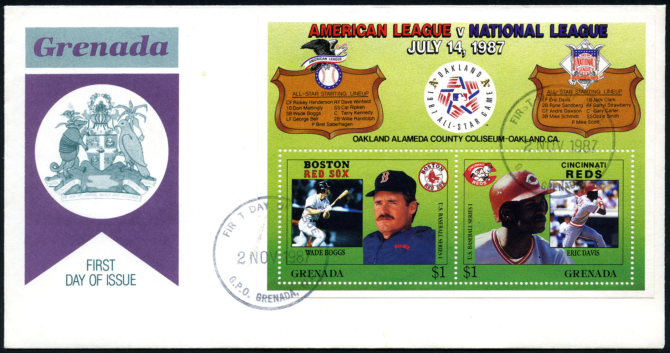 No. Scott: 1552 -- Año de emisión: 1987 -- Valor facial: 2d -- Multicolor -- Con perforación: 13 -- Tipo de Impresión: Litografía. Sobre de Primer Día de emisión con sello de cancelación y Hoja recuerdo con emblemas de la Liga Americana y la Liga Nacional y dos timbres: a) Wade Boggs de los Medias Rojas de Boston y b) Eric Davis de los Rojos de Cincinnati. Para más información favor de dirigirse a biblioteca@mufi.org.mx.