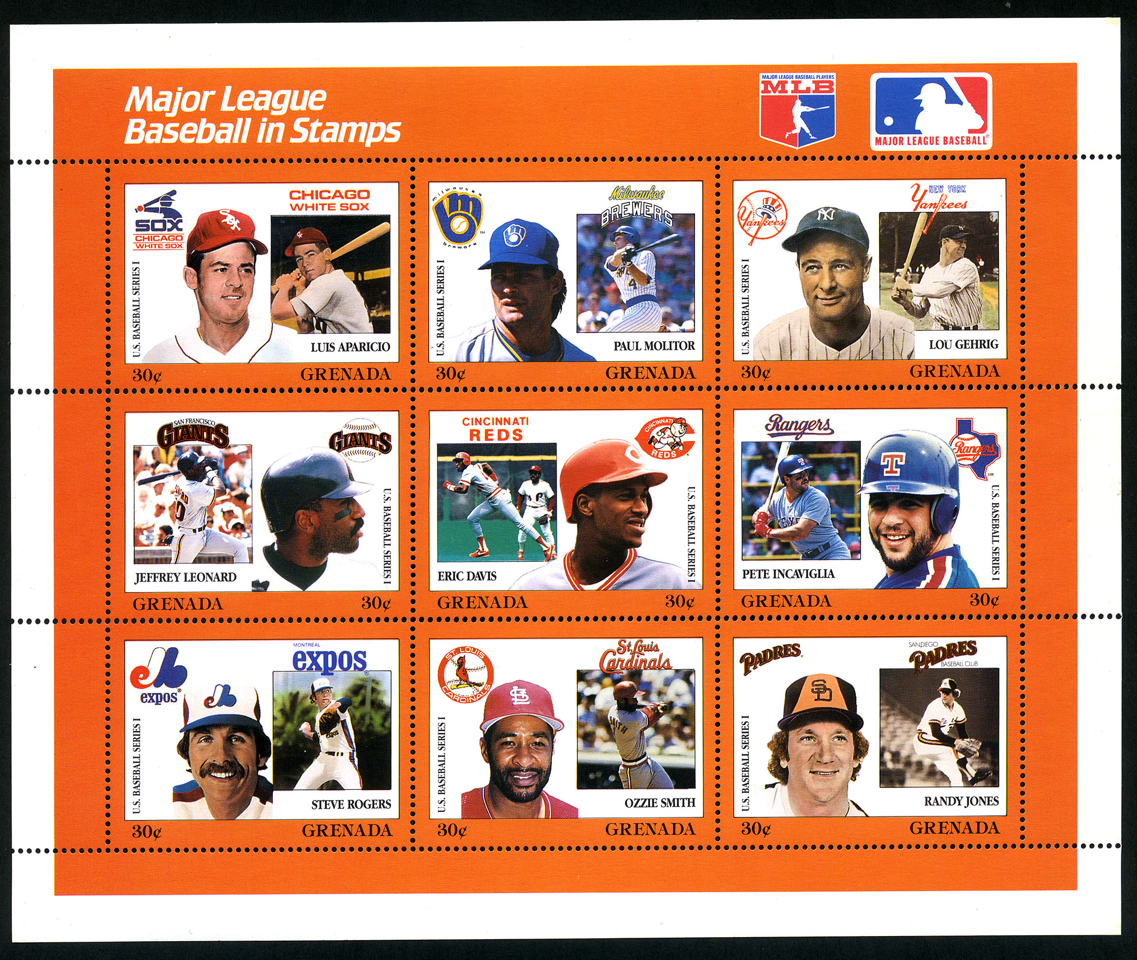 No. Scott: 1672 -- Año de emisión: 1988 -- Valor facial: 9*30c -- Multicolor -- Con perforación: 14 -- Tipo de Impresión: Litografía. Granada, 1988. Grandes Ligas del Beisbol en timbres. Mini planilla de nueve timbres con diferentes jugadores de beisbol: a) Luis Aparicio; b) Paul Molitor; c) Lou Gehrig; d) Jeffrey Leonard; e) Eric Davis; f) Pete incaviglia; g) Steve Rogers; h) Ozzie Smith; i) Randy Jones. Para más información favor de dirigirse a biblioteca@mufi.org.mx.
