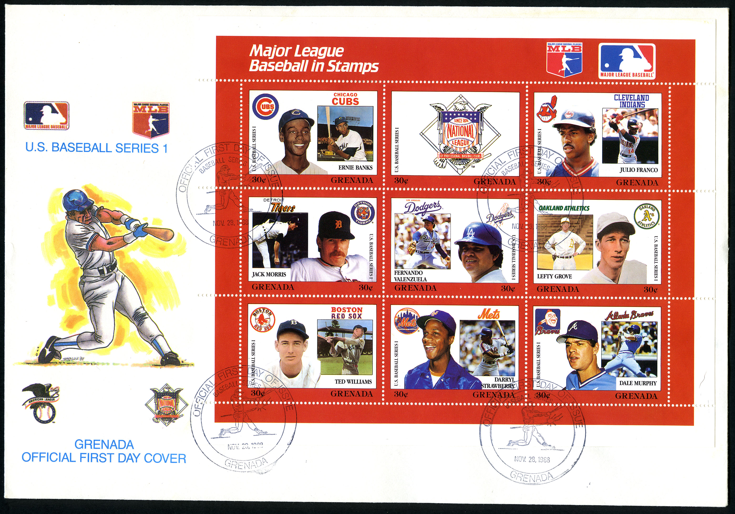 No. Scott: 1667 -- Año de emisión: 1988 -- Valor facial: 9*30c -- Multicolor -- Con perforación: 14 -- Tipo de Impresión: Litografía. Granada, 1988. Grandes Ligas del Beisbol en timbres. Sobre de Primer Día de emisión con sello de cancelación y mini planilla de nueve timbres con diferentes jugadores de beisbol: a) Ernie Banks; b) Emblema de la Liga Nacional; c) Julio Franco; d) Jack Morris; e) Fernando Valenzuela; f) Lefty Grove; g) Ted Williams; h) Darryl Strawberry; i) Dale Murphy. Para más información favor de dirigirse a biblioteca@mufi.org.mx.