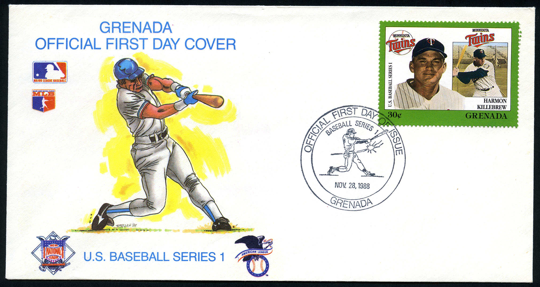No. Scott: 1669i -- Año de emisión: 1988 -- Valor facial: 30c -- Multicolor -- Con perforación: 14 -- Tipo de Impresión: Litografía. Granada, 1988. Beisbol Series I. Sobre de Primer Día de emisión con sello de cancelación pictográfico y timbre de Harmon Killebrew Para más información favor de dirigirse a biblioteca@mufi.org.mx.