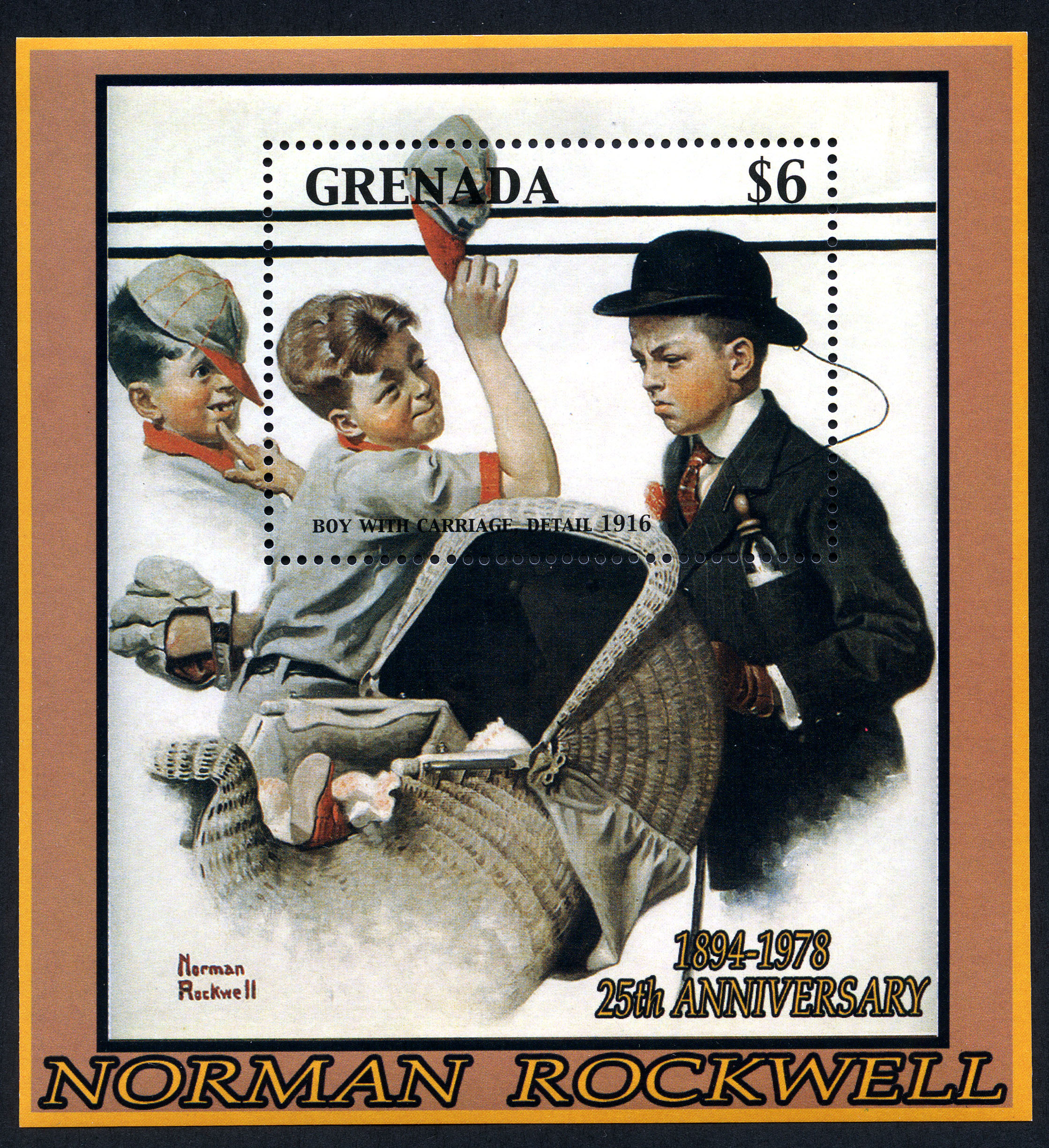 No. Scott: 3414 -- Año de emisión: 2003 -- Valor facial: 6c -- Multicolor -- Con perforación: 13 -- Tipo de Impresión: Litografía. Granada, 2003. Pinturas de Norman Rockwell. Hoja Recuerdo con la pintura "Muchacho con carriola (1916)", que fue la primera portada de Rockwell para The Saturday Evening Post. El autor se sirvió de un único modelo para dibujar a los tres chicos, dos de ellos vestidos de beisbolistas. Para más información favor de dirigirse a biblioteca@mufi.org.mx.