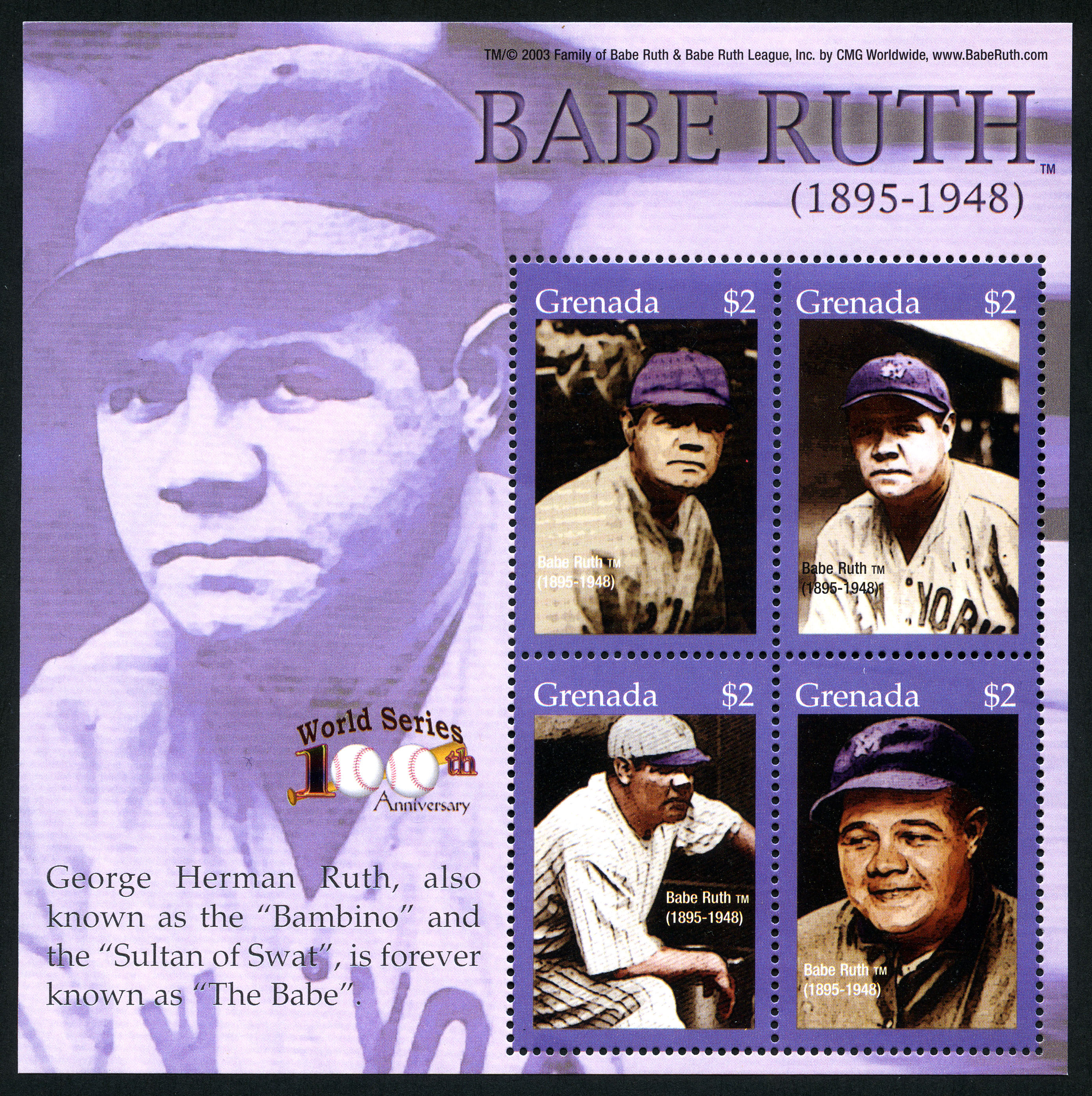 No. Scott: 3476 -- Año de emisión: 2004 -- Valor facial: 4* 2c -- Multicolor -- Con perforación: 14 -- Tipo de Impresión: Litografía. Hoja recuerdo en color violeta, de cuatro timbres con diferentes fotografías del beisbolista Babe Ruth. Para más información favor de dirigirse a biblioteca@mufi.org.mx.